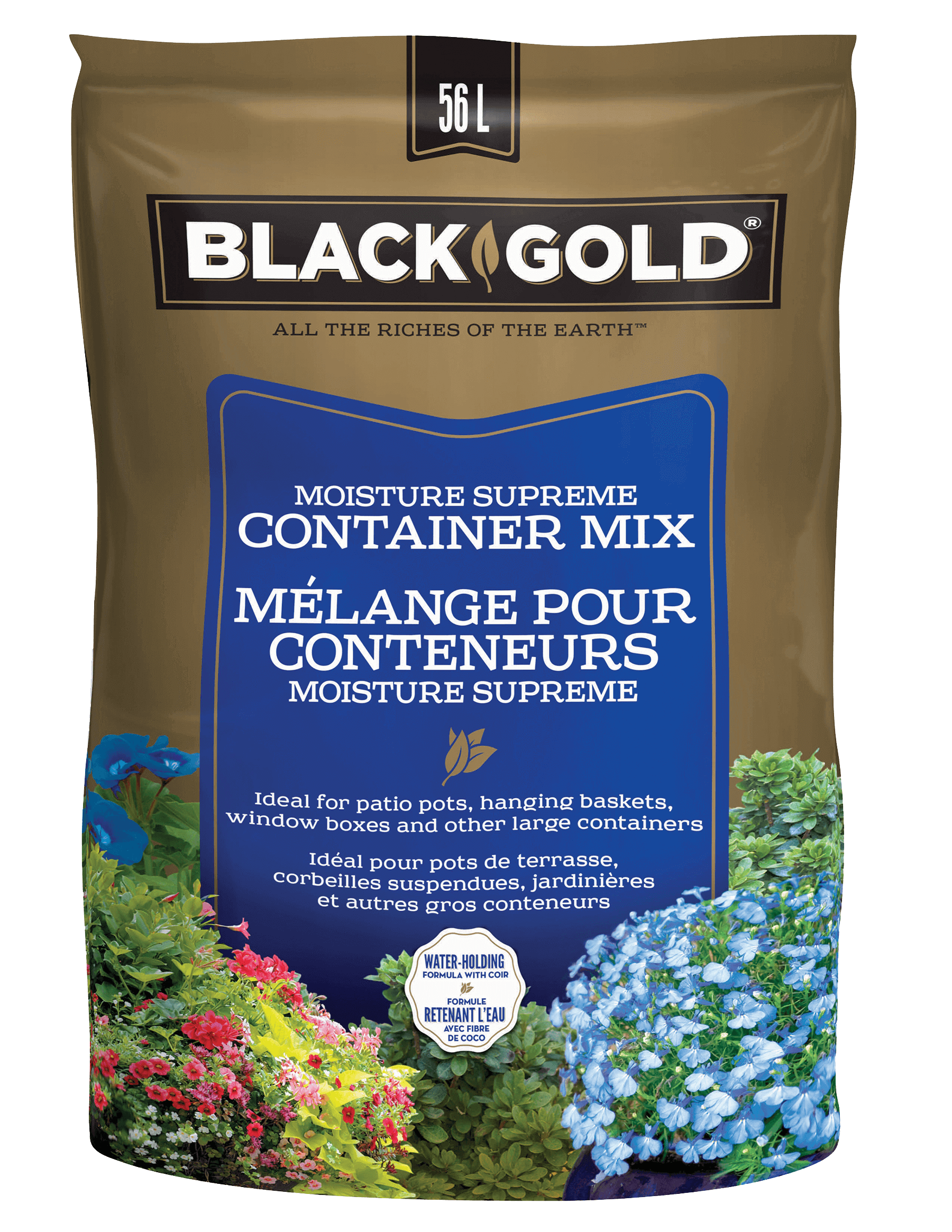 A premium value added potting mix, Black Gold® Moisture Supreme Container Mix includes coir, which retains and slowly disseminates water, so you don’t have to water as often. It is a great choice for container plantings that require daily irrigation, such as patio pots, hanging baskets, window boxes and other containers.